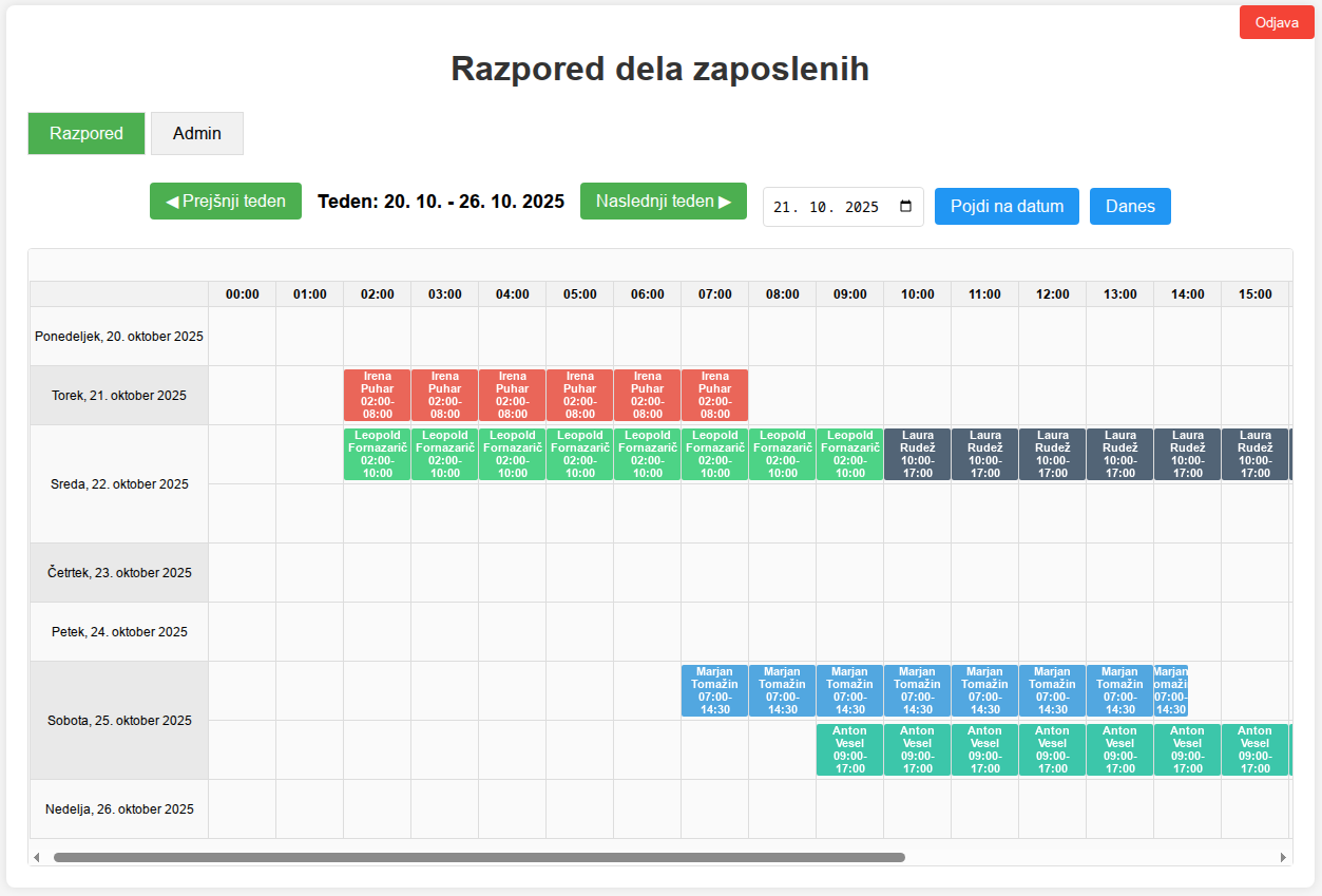 Kompleten pregled razporeda dela zaposlenih ter administrativni del (za vodjo) za vnašanje in urejanje izmen.