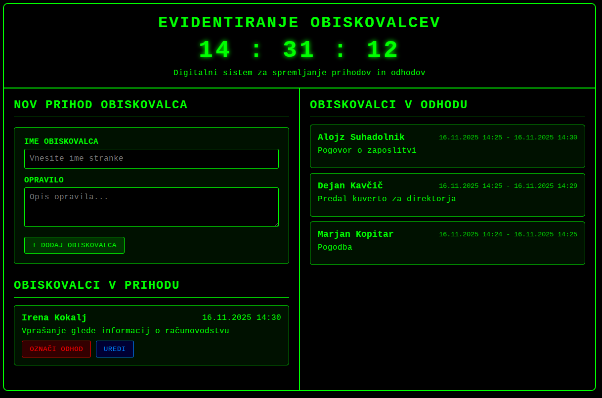 Evidentiranje prihodov in odhodov obiskovalcev pisarne ali poslovnega prostora ter vnos namena obiska.
